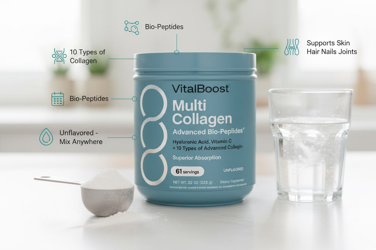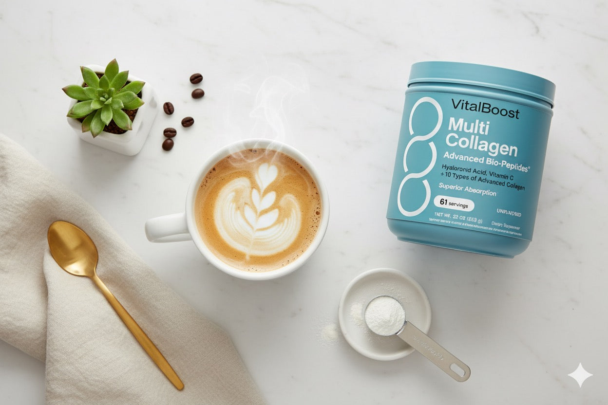 One scoop of VitalBoost Multi Collagen stirs invisibly into your favorite morning brew. No flavor change. No gritty texture. Just smooth, delicious coffee that's secretly working to transform your skin, strengthen your hair, support your joints, and boost your overall vitality.